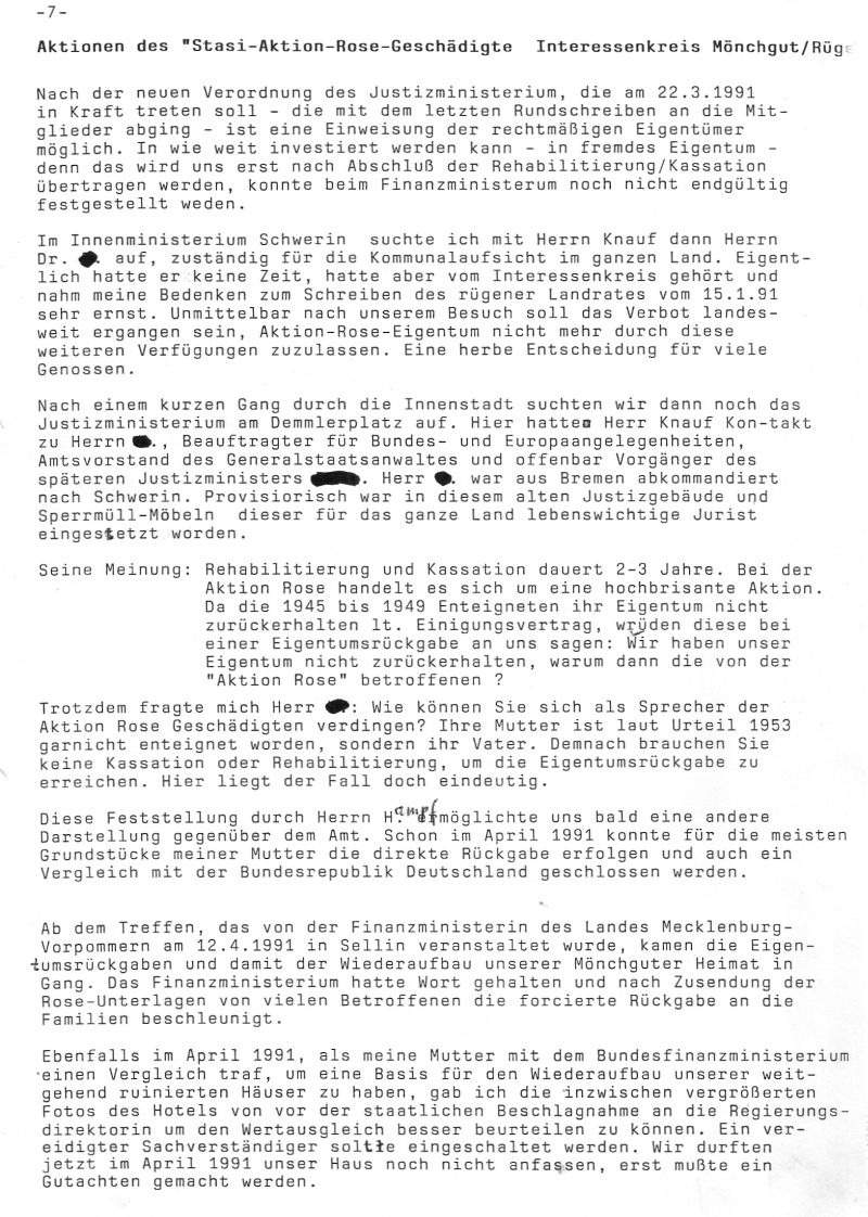 Gespräch mit Herrn Hampf, Aufbauhelfer des Justizminiteriums Schwerin am 15.2.1991: "Ihre Mutter wurde nicht enteignet, nur Ihr Vater und der war nicht der Eigentümer. Die direkte Rückgabe kann sofort erfolgen in Göhren und Baabe." |